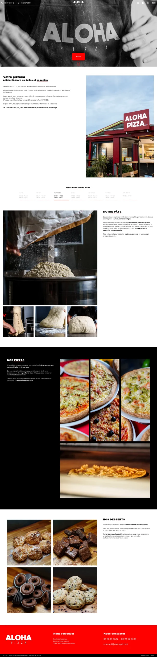 Un site moderne et dynamique qui reflète parfaitement l'identité d'Aloha Pizza. Les animations apportent du mouvement sans nuire à la navigation et les clients trouvent facilement les informations qu'ils cherchent (carte, horaires, contact).