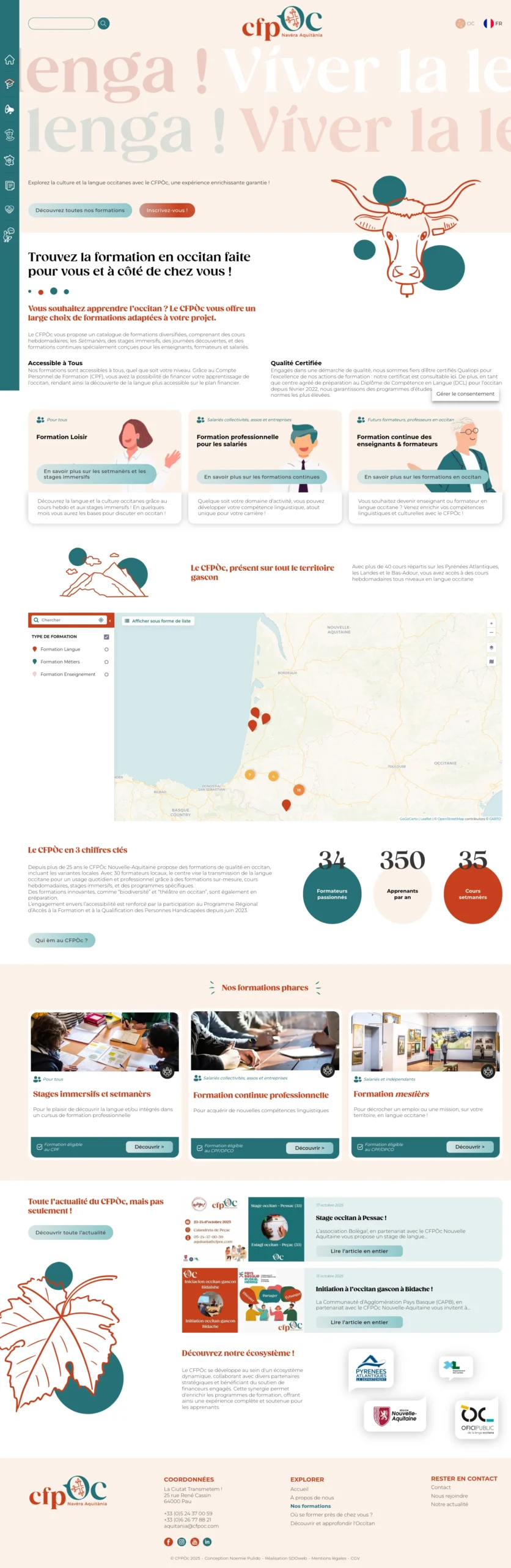 Un site institutionnel moderne et fonctionnel qui valorise l'identité occitane du CFPÒc. L'équipe gère en autonomie son catalogue de formations et les visiteurs peuvent explorer le réseau via la carte interactive, le tout dans la langue de leur choix.