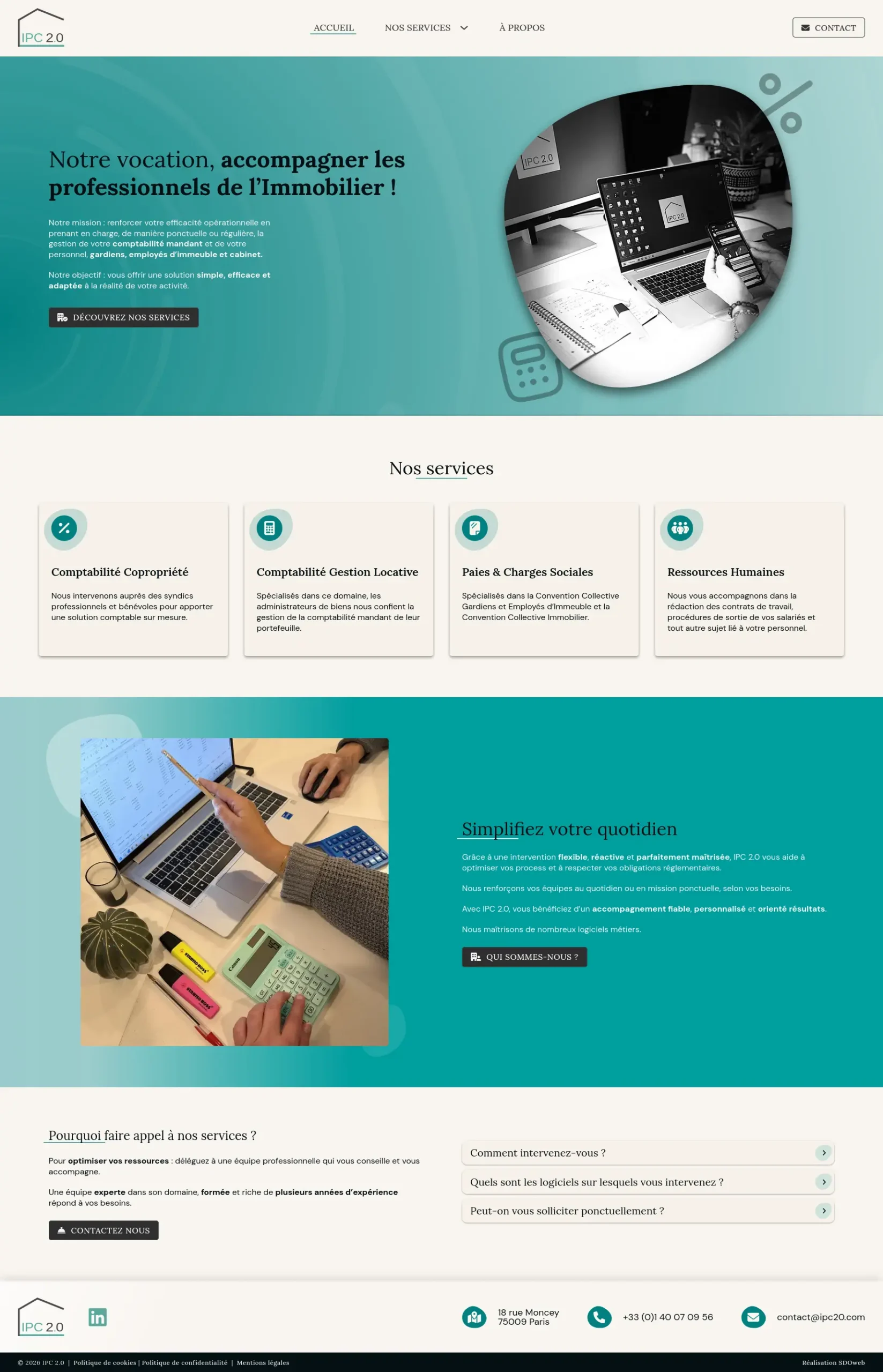 IPC 2.0, cabinet spécialisé dans la gestion comptable et les ressources humaines pour les copropriétés et la gestion locative, souhaitait créer son site vitrine avec une identité visuelle forte et professionnelle. L'enjeu : présenter clairement un panel de services techniques (comptabilité mandant, paies, charges sociales, RH) à une clientèle professionnelle exigeante, tout en restant accessible et lisible.