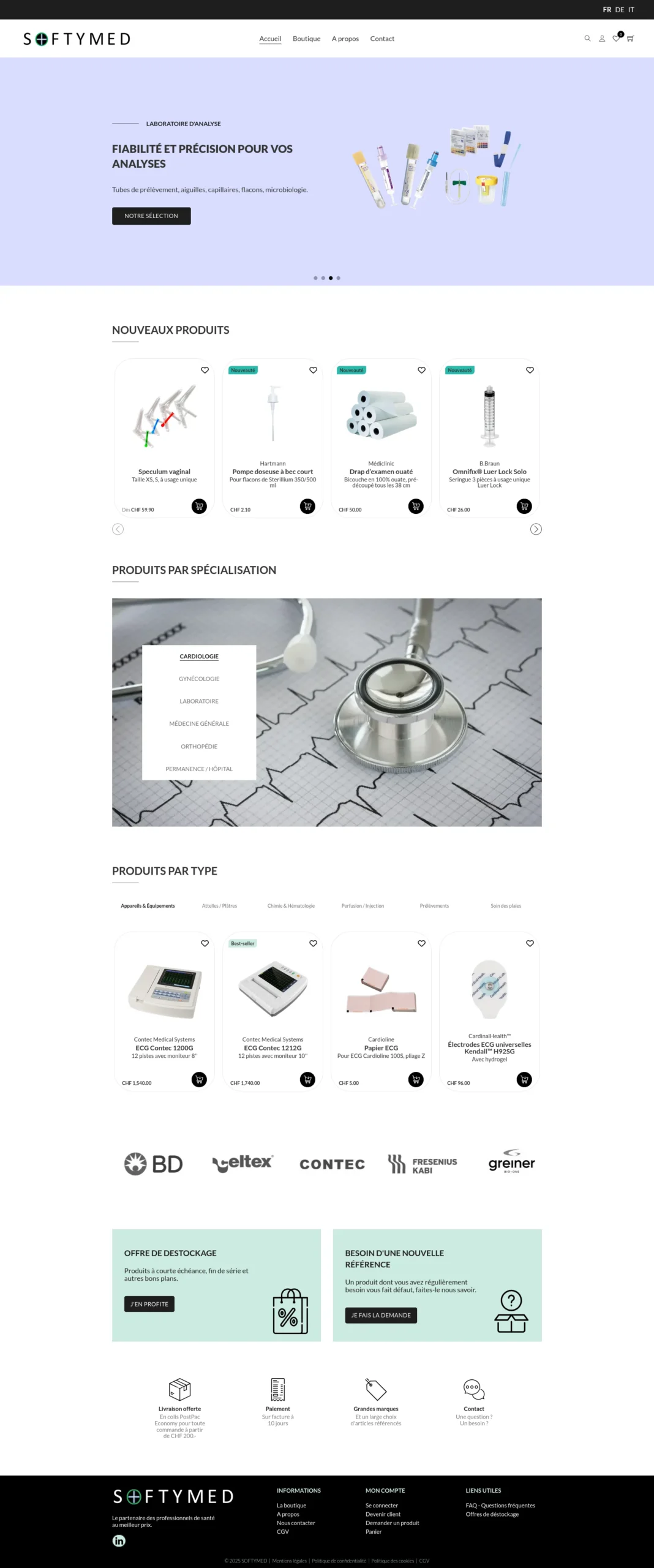 SOFTYMED, spécialisée dans la vente de matériel médical, souhaitait refondre complètement son site e-commerce vieillissant. L'enjeu : créer une boutique en ligne moderne adaptée à leur clientèle B2B, avec une gestion des prix différenciée selon le type de client (professionnels de santé, établissements, revendeurs) et une présence multilingue pour leurs marchés européens.